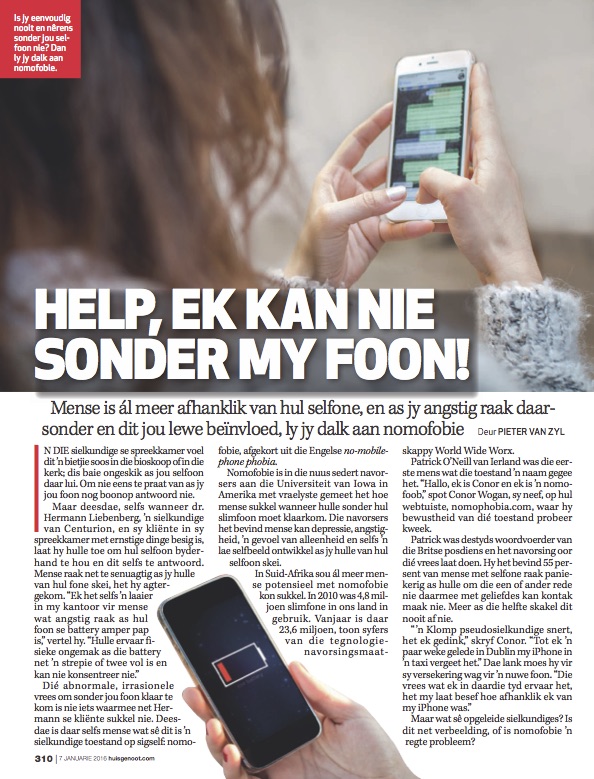 Larissa Ernst shares her views on mobile phone addiction in this article published in South Africa's biggest weekly mag, Huisgenoot/You: